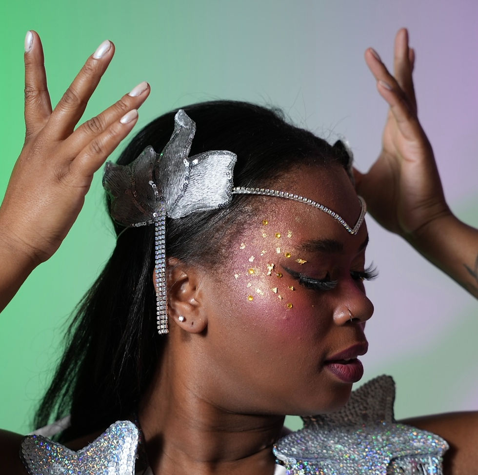 Com uma vibe inseta futurista, nossa máscara pode ser fixada através da fita dupla face em sua base. Para melhor fixação sugerimos passar cola de cilios ou de peruca em todos os pontos de contato com a pele. 🧚🏼♀️